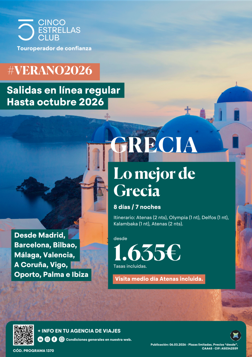 Verano'26 Lo Mejor de Grecia 8d/7ns dsd 1.635€ sal.dsd Mad,Bcn,Bio,Agp,Vlc,Lcg,Vgo,Opo,Pmi-Vist.mediodia incl.